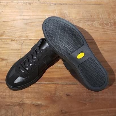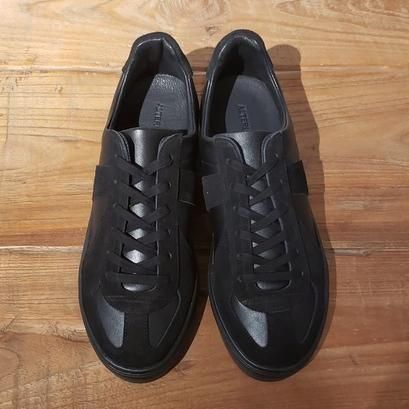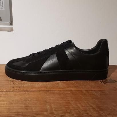 国産のスニーカーブランド「ALTERUM オルタム」。普遍的なヴィンテージモデルやアーカイブスペックを踏襲しつつ、現代的にアップデートすることで価値あるフットウェアを提案するブランド。アイコンモデルであるジャーマンアーミートレーナーは、1970〜90年代初頭に旧ドイツ軍に正式支給されていた屋内トレーニングシューズをモディファイド。アーカイブスペックを忠実に再現したラストを用い、国内タンナーに別注した柔らかく肉厚なレザーをアッパーに使用。ライニングには通気性と耐摩耗性に優れたピッグスキンと速乾吸湿力の高いキャンブレル素材を組み合わせ使用。インソールのクッションには、着地時の衝撃を吸収・分散し、耐久性も兼ね備えた中反発弾性ウレタンフォームを使用。アウトソールは人体工学に基づき設計され、疲れにくくグリップ力と耐久性に優れたビブラムラバーソールを。細部までこだわって作られた履き心地のよいジャーマントレーナーです。トリプルブラックはオールブラックのワントーンで仕立てられたモデル